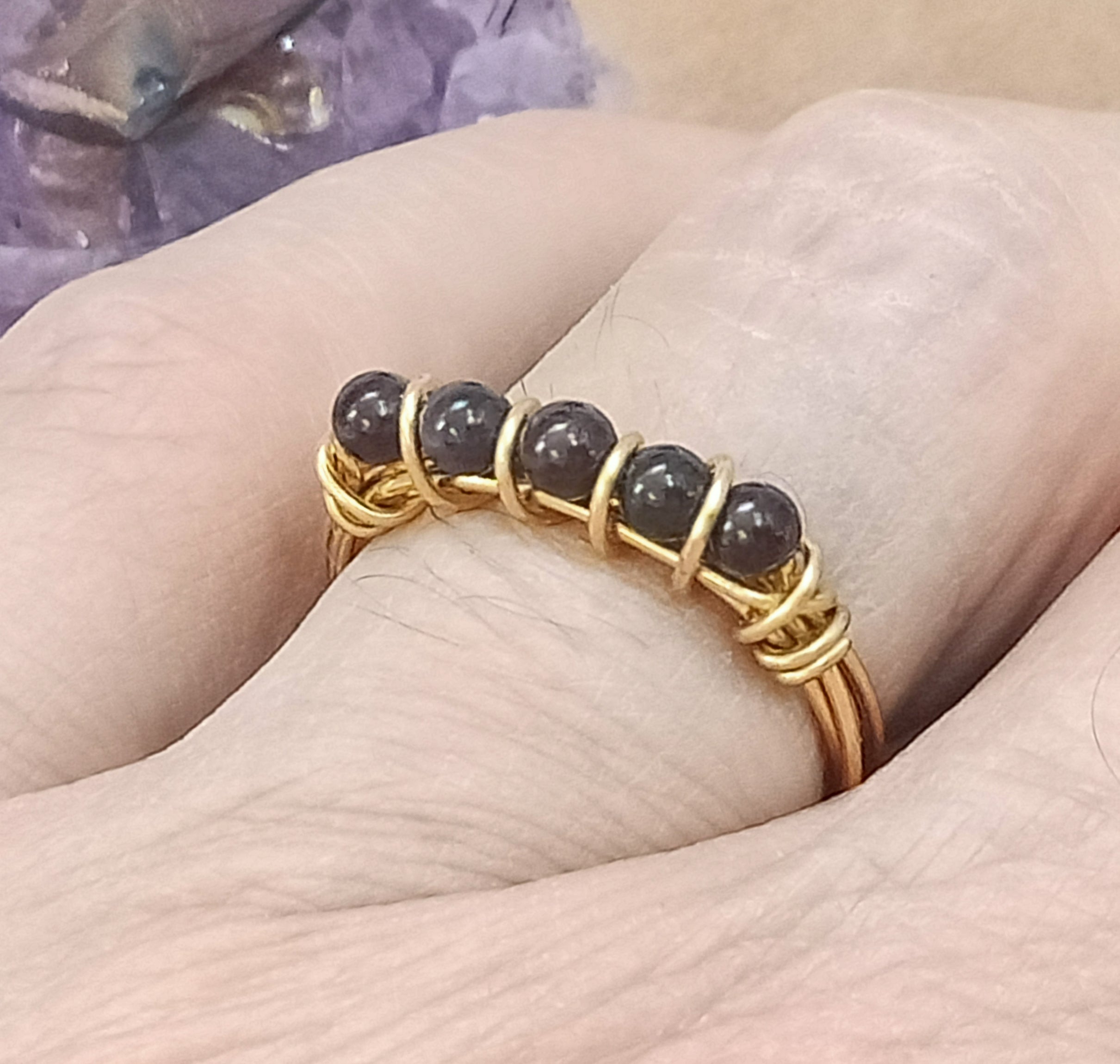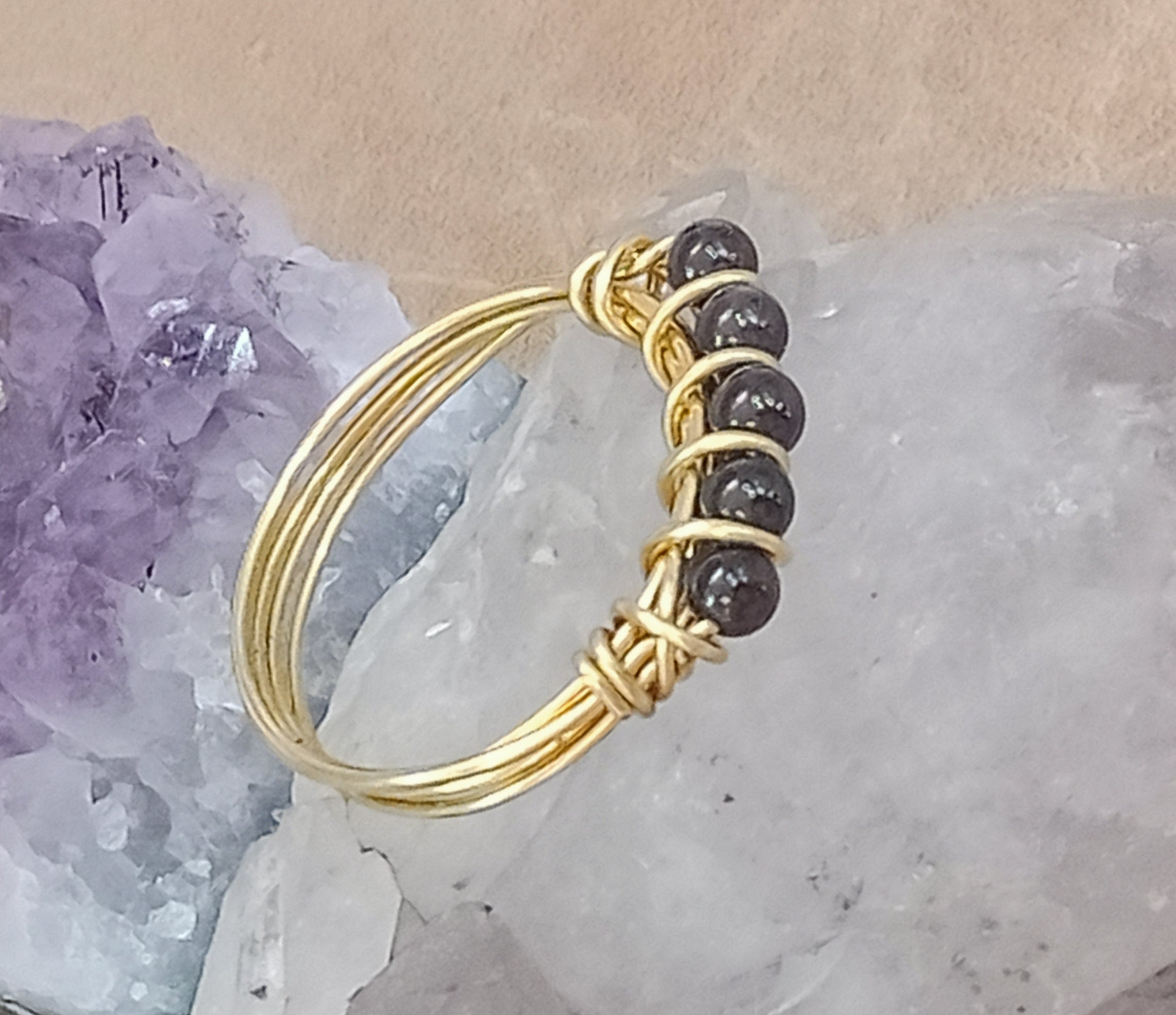 Anillo tejido a mano de alambre chapado en oro y piedra natural Granate.
