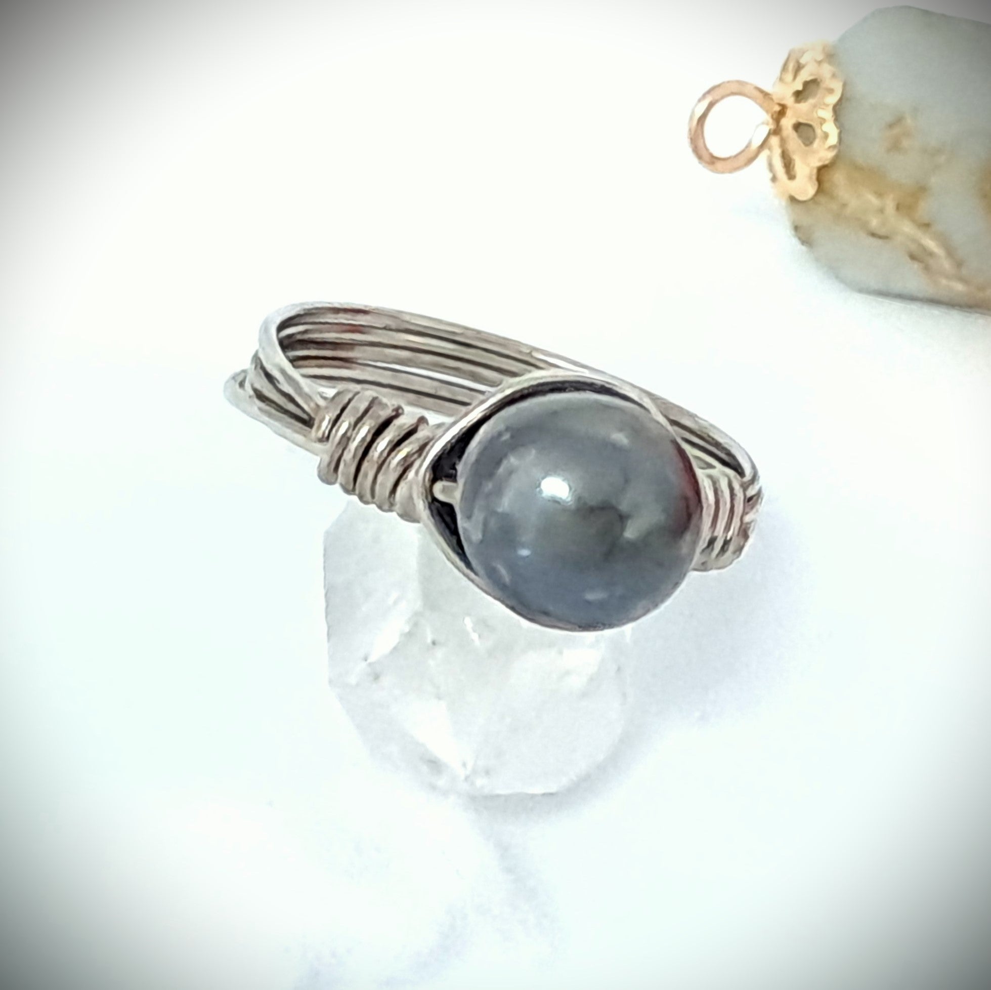 Anillo alambre tejido a mano chapa rodio plata con perla gris de cultivo.