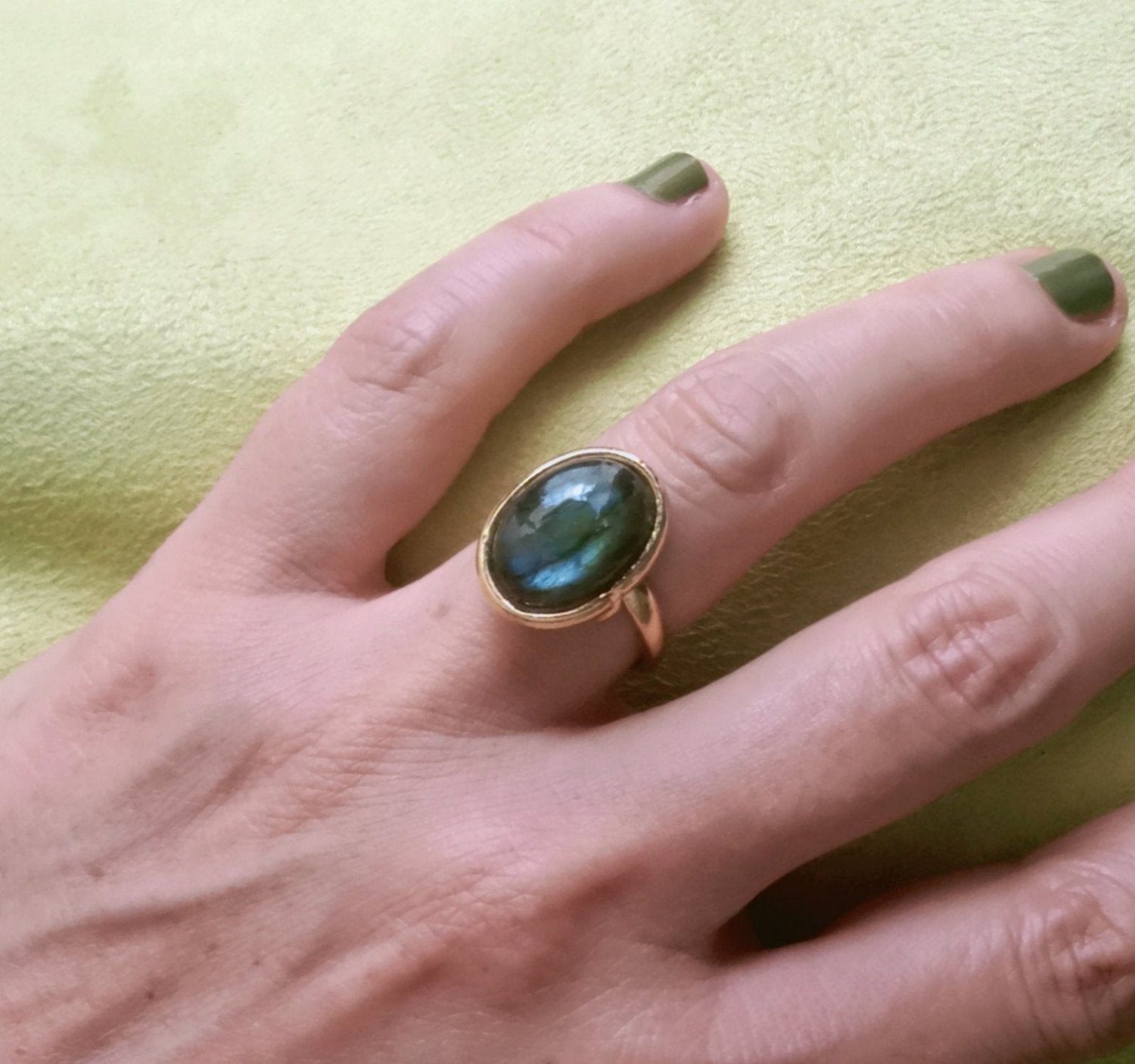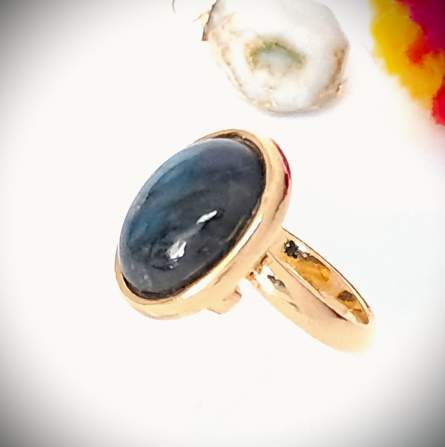 Anillo media caña soldado artesanal chapado en oro de 18K con piedra Labradorita natural. (los colores podrían variar levemente) Calidad triple A.