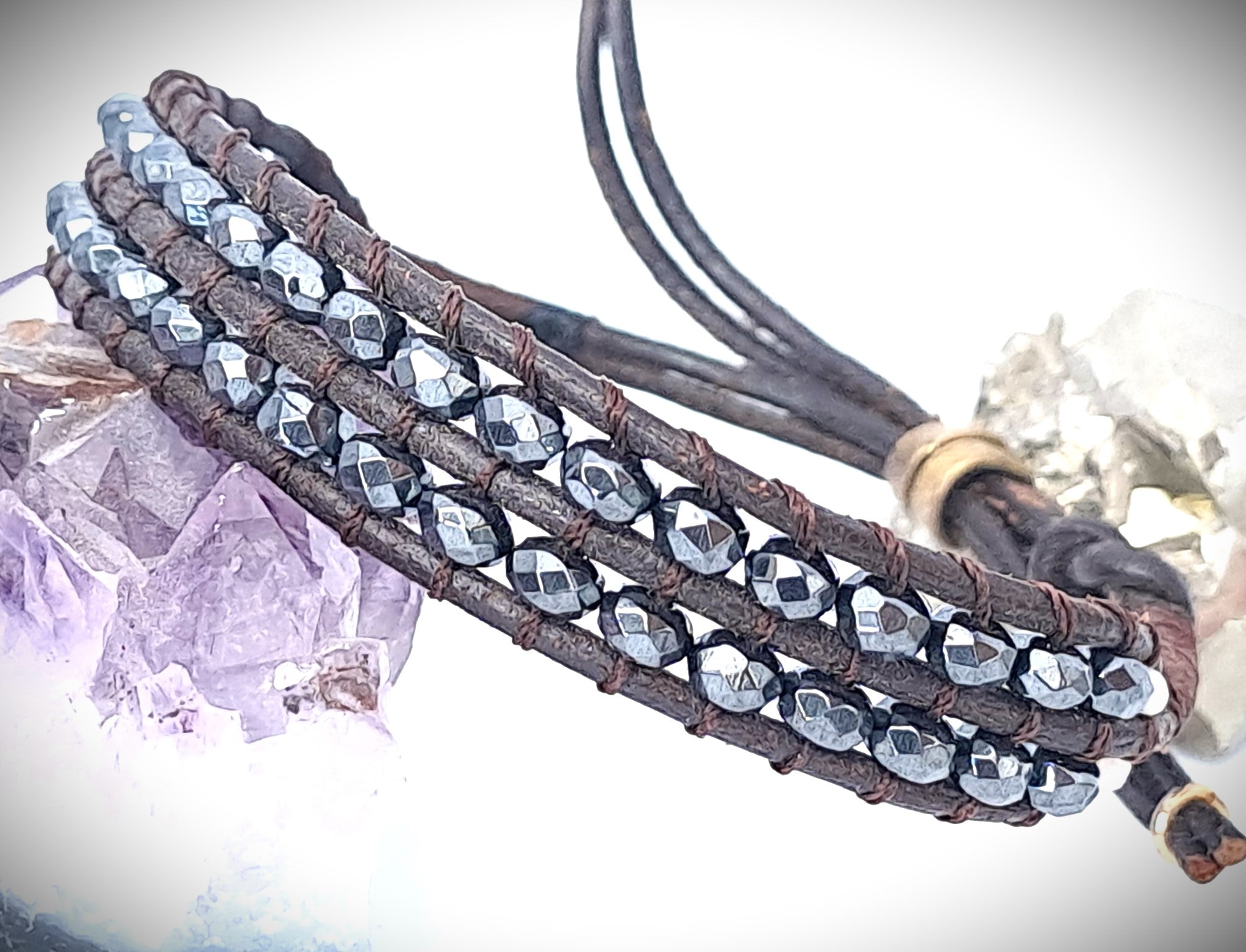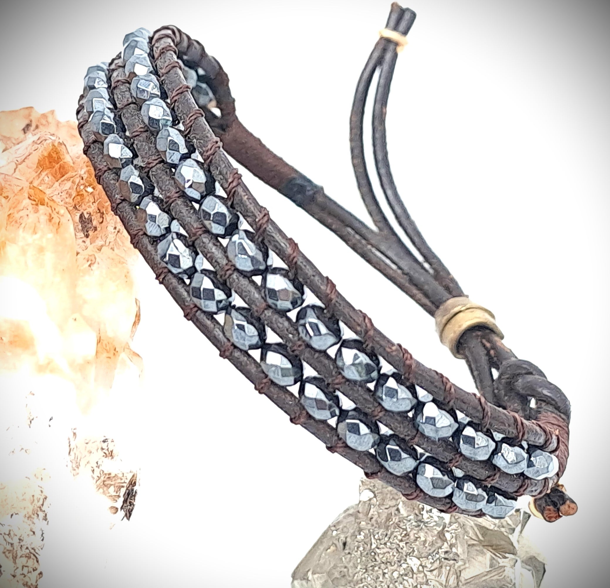 Pulsera brazalete hecho a mano en piel con mineral de hematita ajustable.