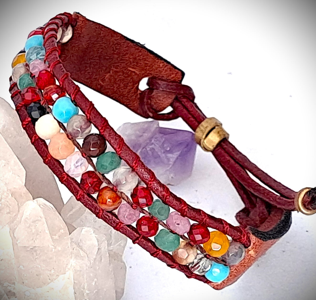 Pulsera brazalete tejido a mano en piel, piedra natural varias ajustable.