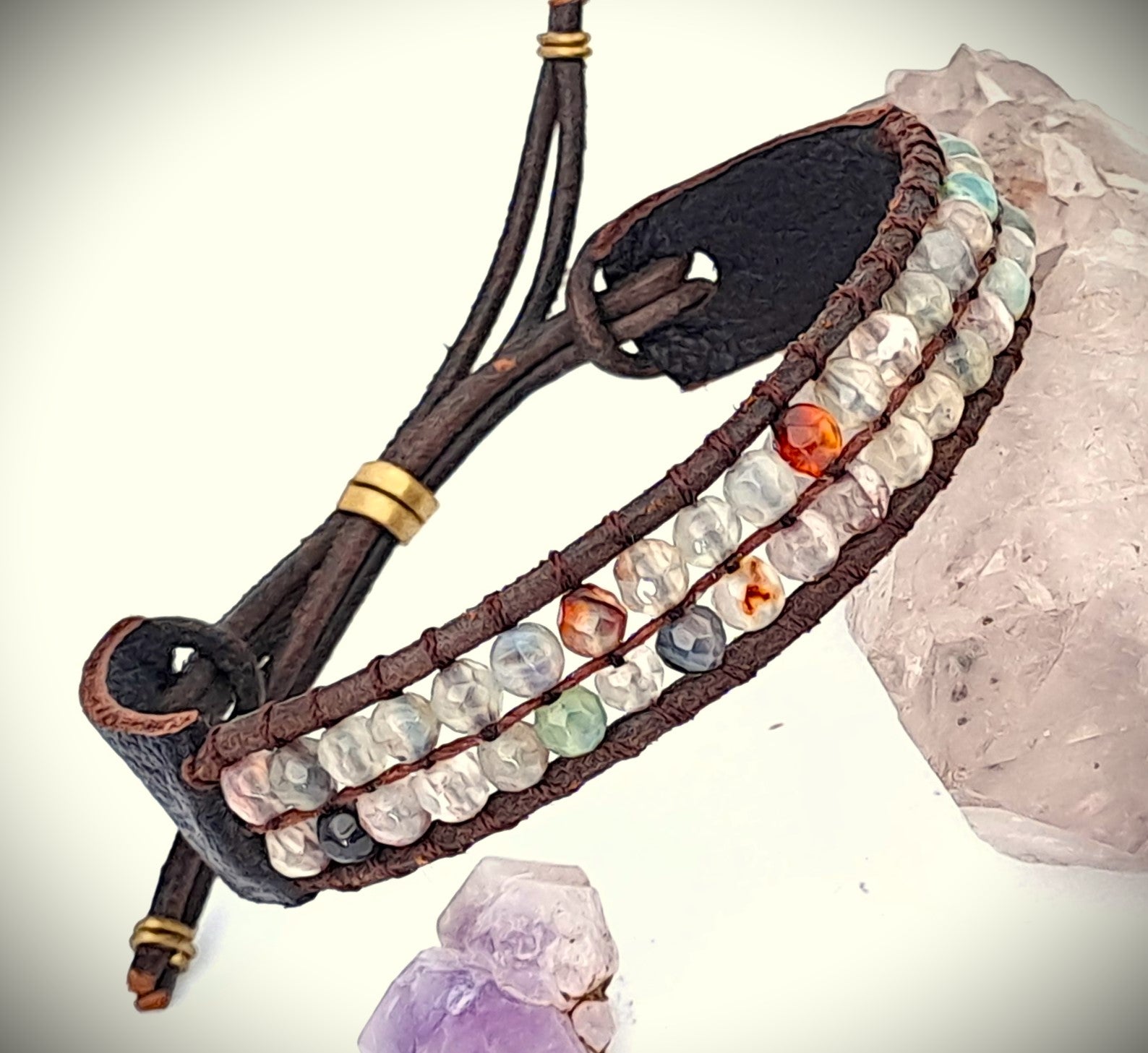 Brazalete tejido a mano en piel, piedra natural ágata facetada ajustable.