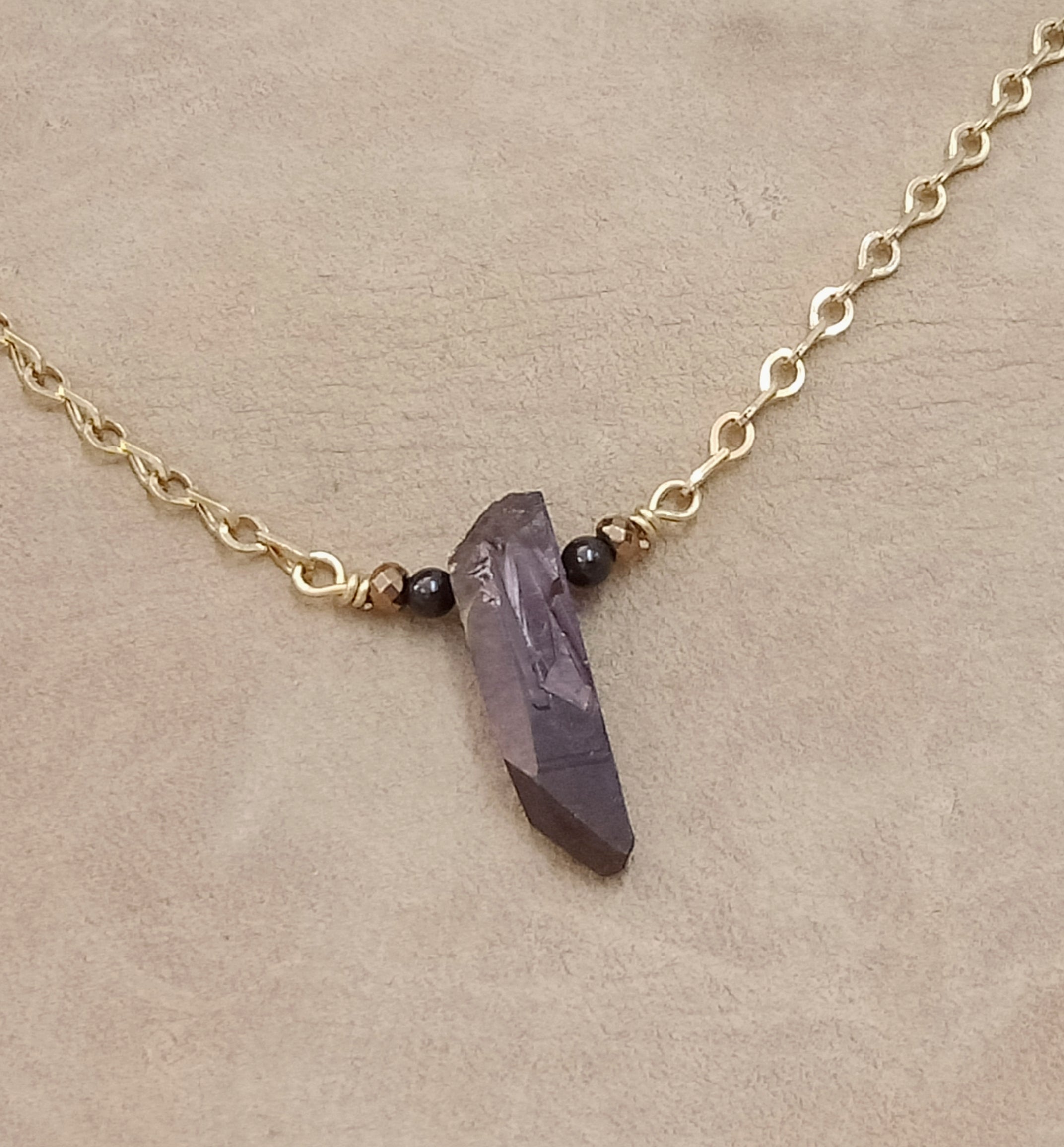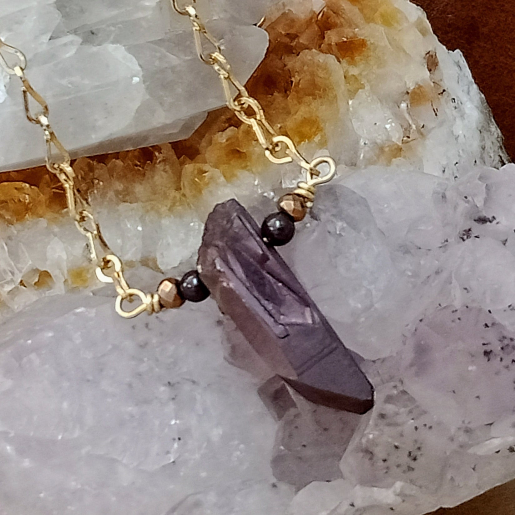 Cadena chapada en oro 18k con raro cuarzo metálico y vivos en granate y hematita.