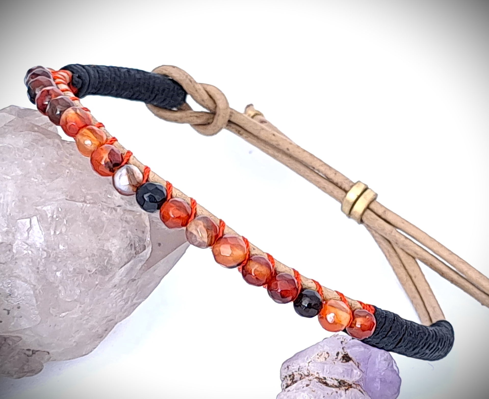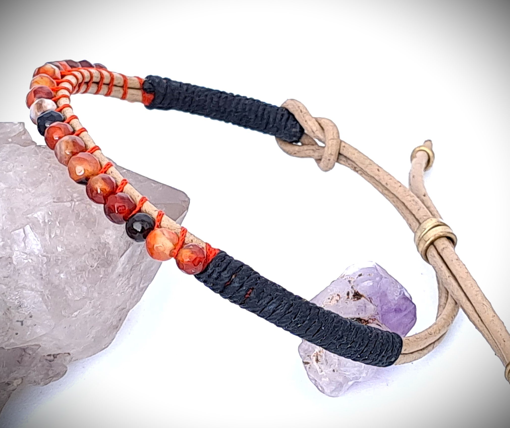 Pulsera brazalete tejido a mano en piel con piedra natural ágata coralillo.