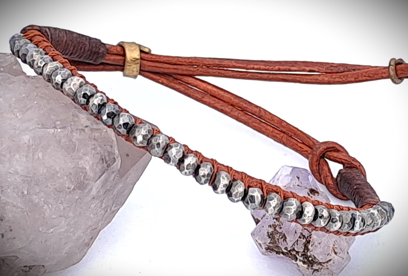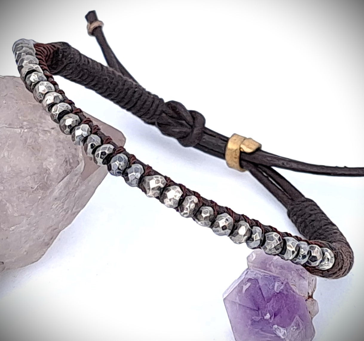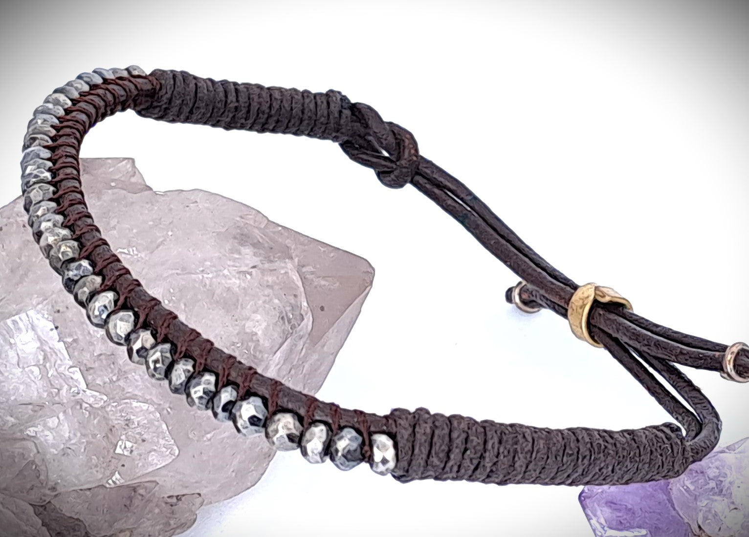 Pulsara brazalete tejido a mano en piel con piedras naturales pirita.