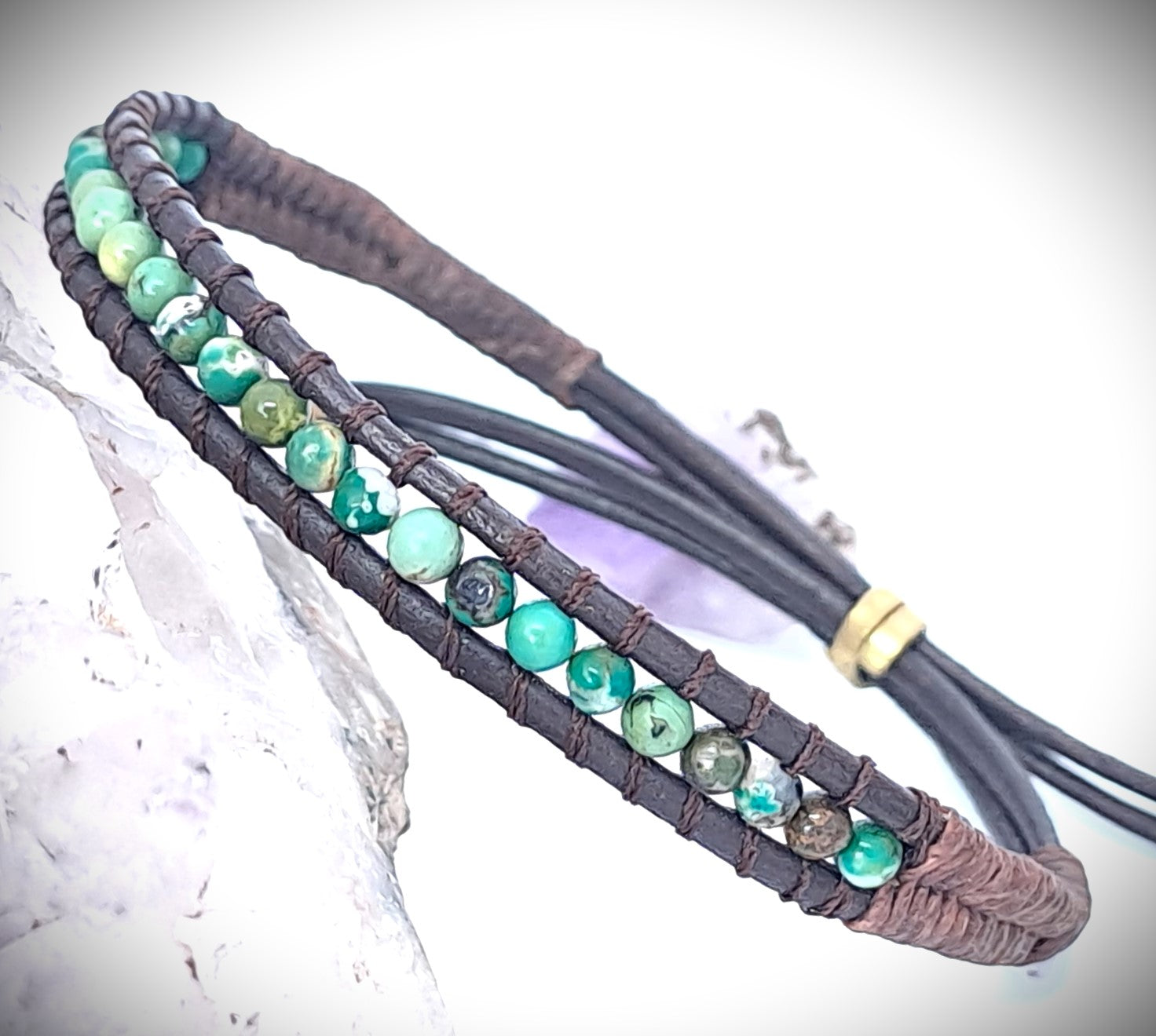 Pulsera brazalete tejido a mano en piel con piedra natural turquesa.