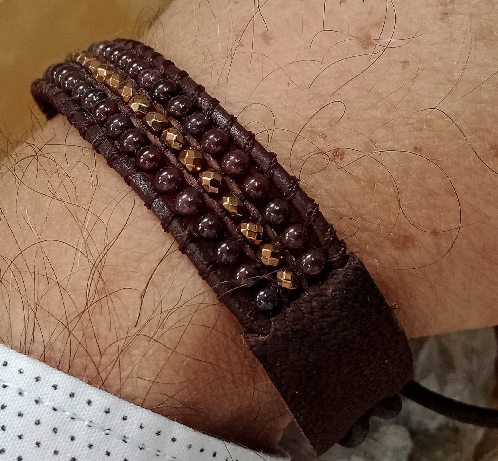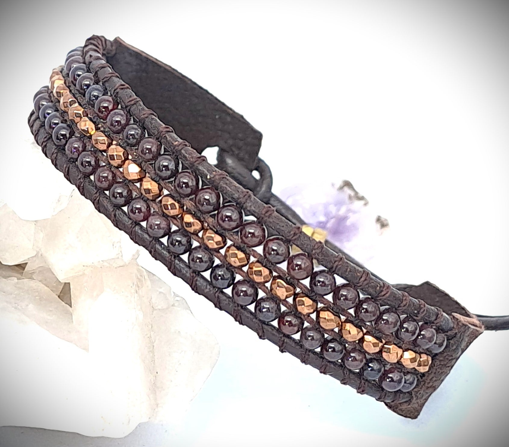 Pulsera brazalete hacho a mano en piel ajustable con Granate bola y Hematita.