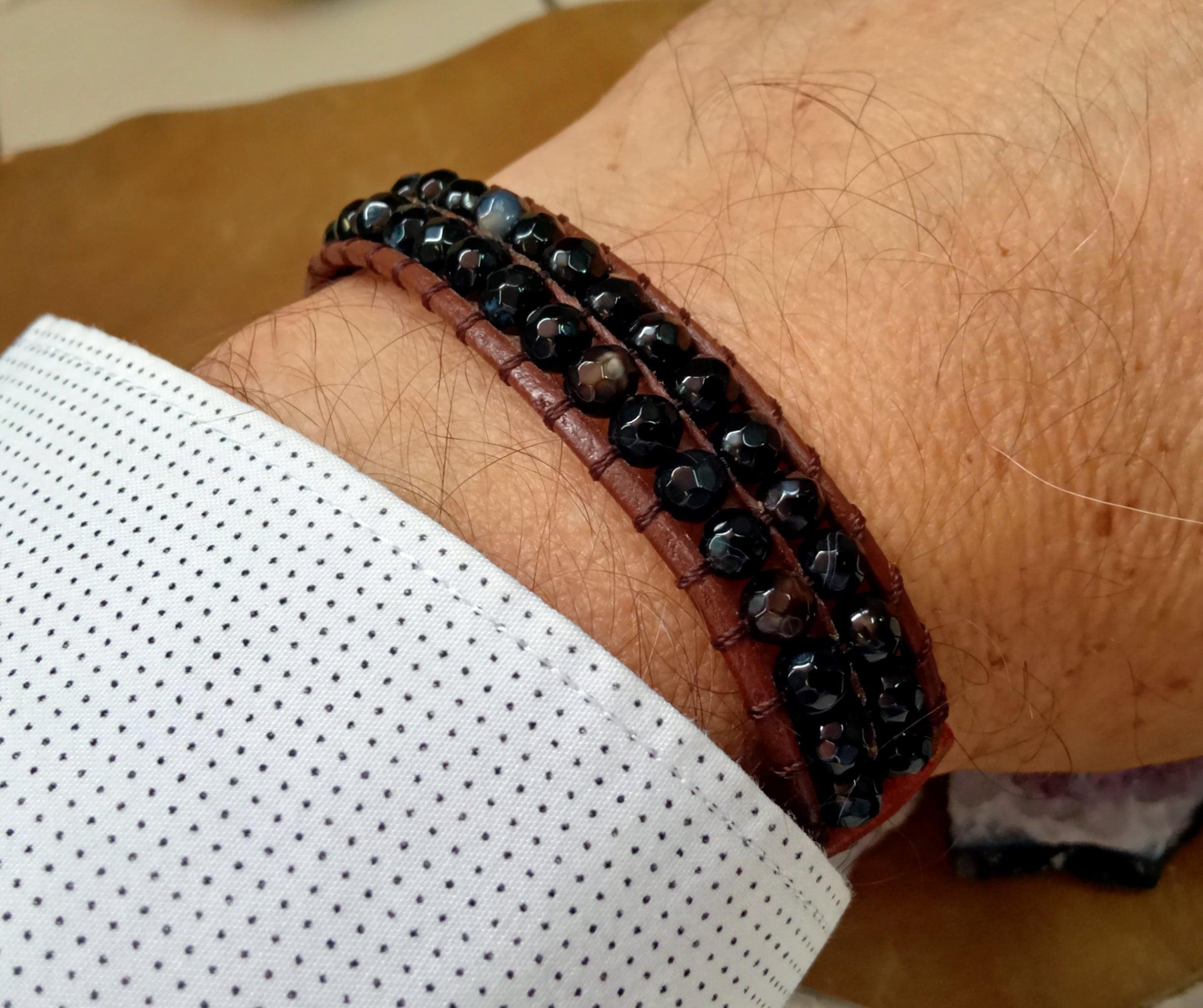 Brazalete tejido a mano en piel ajustable con piedra natural ágata calcedonia.